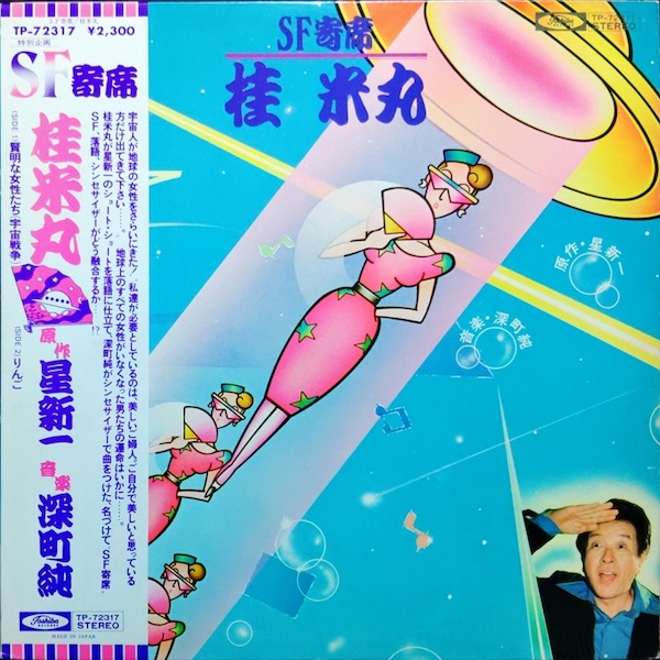 映画『未知との遭遇』(1977年)や『スター・ウォーズ』のヒットにより、日本はオカルト・ブームからSFブームへ。そんな時代に、FM東京の特別企画として制作され、その後レコード化されたのがこの『SF寄席』。片面一席ずつ、計二席ともに原作は星新一。音楽は作編曲家であり、スーパー・キーボーディストの深町純。そして演ずるは、新作落語一本で落語界を生き抜いた桂米丸。わくわくする組み合わせでしょう。落語の声はセンターに定位しますが、シンセサイザーの伴奏はしっかりとステレオ。UFOや宇宙人といった現実離れした題材を、電子音が的確に補足します。深町純らしいグルーヴ感を隠し切れないのも、聴きどころです。